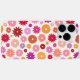 Colorful flower pattern in yellow, orange, pinks, lilac and reds on a cream color background.