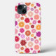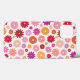 Colorful flower pattern in yellow, orange, pinks, lilac and reds on a cream color background.