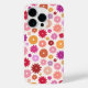 Colorful flower pattern in yellow, orange, pinks, lilac and reds on a cream color background.