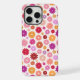 Colorful flower pattern in yellow, orange, pinks, lilac and reds on a cream color background.