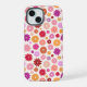 Colorful flower pattern in yellow, orange, pinks, lilac and reds on a cream color background.