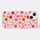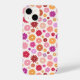 Colorful flower pattern in yellow, orange, pinks, lilac and reds on a cream color background.
