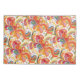 Mala-almofada brilhante e alegre com padrões de cor laranja, cor-de-rosa, amarelo e cor-de-rosa num fundo branco.