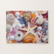 Conchas muito coloridas num quebra-cabeça de praia arenoso.