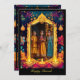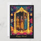 A frente do cartão de saudação "Diwali Night Glow" está lindamente adornada com padrões intrincados e vibrantes. Ao redor da foto central estão os motivos tradicionais da Índia, como designs florais detalhados, penas de pavão e lâmpadas de óleo iluminado (diyas), que simbolizam a luz e a alegria de Diwali. As cores são predominantemente ricas e profundas, com tons de preto, ouro e traços de vermelho e laranja, criando uma atmosfera festiva e elegante. O texto na frente diz "Happy Diwali" em um roteiro grande, elegante e amarelo, seguido de "from [Your Family Name]" em uma fonte branca menor, o texto pode ser personalizado. O fundo ao redor da moldura é ricamente decorado, melhorando a sensação celebratória da carta. A parte de trás da carta continua o tema sofisticado com um fundo preto sólido que corresponde às cores da frente. Esta área apresenta texto personalizável em escrevendo branco, fornecendo espaço para uma mensagem pessoal ou saudação. O design geral é festivo e elegante, perfeito para celebrar a alegre ocasião de Diwali com entes queridos.