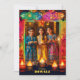 A placa de saudação "Happy Diwali" apresenta um design vibrante e festivo, com padrões ousados e intrincados em torno da imagem personalizada. O quadro é adornado com motifs florais e paisley ricos em tons brilhantes de laranja, rosa, amarelo e verde. A parte superior do quadro mostra flores detalhadas de lótus em matizes multicoloridas, adicionando à atmosfera alegre e colorida do cartão. Na parte inferior, encontram-se dispostas cinco lâmpadas de óleo (diyas) iluminadas, que lançam um ouro quente ao longo do design. As palavras "Happy Diwali" são escritas em uma combinação de ouro elegante e texto branco abaixo da moda, enfatizando o tema comemorativo. A parte traseira da placa apresenta um fundo de marrom sólido, que é personalizável para texto adicional em letra branca. Esse espaço permite mensagens personalizadas, fazer ideal para transmitir desejos de Diwali. O design global é vibrante, quente e comemorativo, capturando a essência de Diwali com seus detalhes coloridos e elementos festivos.