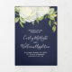 Um elegante programa de casamento floral com um belo arranjo de flores brancas e cor-de-água, de pedras brancas e verde. Mostrada com uma cor azul de fundo marinho que pode ser personalizada para corresponder ao seu tema de casamento. Basta selecionar o botão 'personalizar' para ver opções adicionais de design.