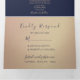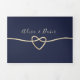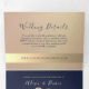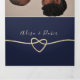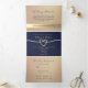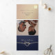 Simples, elegante, convite de casamento tri-dobrável minimalista em rosa dourado e azul marinho, com linda corda em foil dourado e foto do casal.