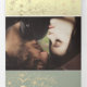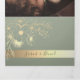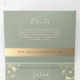 Simples, elegante, convite de casamento tri-fold moderno verde sage, com renda floral de folha dourada adorável e foto do casal.