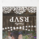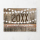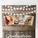 Um convite trifold de festa de formatura country rústico 2 em 1 com um fundo de barril de madeira rústico, luzes de corda cintilantes, padrão floral delicado de babys breath, fotos do formando, o ano da turma, detalhes da celebração de formatura e um cartão-postal de RSVP para os convidados destacarem e enviarem de volta.