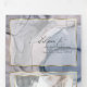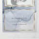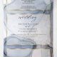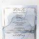 Salpico etéreo de manchas de tinta alcoólica em tons de azul empoeirado, mauve, roxo ameixa e rosa profundo - cada seção destacada com uma sobreposição emoldurada em branco translúcido dourado, na parte central frontal está sua foto acentuada com uma moldura dourada e atrás da sobreposição branca translúcida para um apelo esotérico, um belo design abstrato moderno para um convite de casamento completo, incluindo opção de refeição destacável pré-endereçada para resposta, para que seus convidados possam facilmente devolver por correio - um convite de casamento impressionante tudo-em-um -