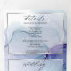Salpico etéreo de manchas de tinta alcoólica em tons de aqua impressionante, roxo violeta e lilás pálido - cada seção destacada com uma sobreposição branca translúcida emoldurada em prata platina, na frente central está sua foto acentuada com uma moldura dupla dourada e atrás da sobreposição branca para um apelo esotérico, um belo design abstrato moderno para um convite de casamento completo, incluindo opção de refeição destacável pré-endereçada para resposta dos convidados para facilmente enviar de volta - um convite de casamento impressionante tudo-em-um -