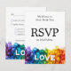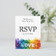 Este é um belo cartão de RSVP vertical da coleção de Casamentos LGBTQ+ Pintados com Amor. Ele apresenta um design impressionante com pinceladas infusoras do arco-íris na parte inferior, criando uma base vibrante para a palavra branca e ousada "AMOR". A parte de trás do cartão, projetado para ser totalmente personalizável, diz com destaque "Nós adoraríamos ouvir de você" e "RSVP", seguido do prazo final. A frente da placa foi projetada para que seus convidados respondam facilmente. Ele fornece uma linha para que eles escrevam seu nome e caixas de seleção para indicar se eles irão "aceitar com prazer" ou "lamentavelmente recusar". Há também um espaço para eles especificarem o número de convidados. Uma característica chave desta carta é a opção de os hóspedes selecionarem a sua escolha de refeição numa lista personalizável, como "salmão grelhado com molho limão", "filet mignon com redução do vinho tinto" e "pimentões de recheio vegetarianos". Além disso, existe uma linha separada para os convidados informarem sobre quaisquer requisitos dietéticos especiais, garantindo uma experiência suave e agradável para todos. Essa placa combina perfeitamente o design elegante com funcionalidade prática, fazer o processo RSVP simples e na moda.