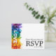 Esta bela placa de cerimônia RSVP faz parte da coleção de Casamentos Pintados com amor LGBTQ+. Projetada para complementar o convite para o casamento, a carta horizontal apresenta uma vibrante cascata de pinceladas com infusão do arco-íris que flui para o lado esquerdo, com a palavra "LOVE" ousadamente colocada verticalmente para pegar o olho. A parte traseira da placa foi projetada para seus convidados responderem facilmente. Ele fornece uma linha para que escrevam seu nome, seguida de caixas de seleção para indicar se eles irão "aceitar com prazer" ou "recusar lamentavelmente" e um espaço para especificar o número de convidados. Uma característica chave desta carta é a opção de os hóspedes selecionarem a sua escolha de refeição numa lista personalizável, como "salmão grelhado com molho limão", "filet mignon com redução do vinho tinto" e "pimentões de recheio vegetarianos". Além disso, a parte inferior da placa inclui um código QR que os convidados podem digitalizar para responder on-line, fazer o processo RSVP simples e moderno. A parte traseira do cartão mantém-no simples com o texto, "Por favor, ajude-nos a planejar e RSVP", seguido da data limite de resposta claramente marcada na parte inferior.