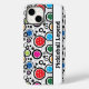 Caso do iPhone 14 com almôndegas coloridas e círculos pretos em fundo branco. Perfeito como presente para um jogador de picleball em moda. Texto personalizado do lado Feliz visto e melhores votos para seus futuros jogos!