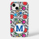 iPhone 14 com Almôndegas coloridas e círculos pretos em fundo branco. Perfeito como presente para um jogador de picleball em moda. Inicial personalizada em um círculo Feliz visto e melhores votos para seus futuros jogos!