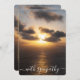 Esta bela carta de simpatia tem uma foto de um pôr do sol ouro sobre o oceano. Os raios solares estão a romper pelas nuvens. As reflexões do sol são visíveis no mar. Na parte de trás do cartão está uma mensagem sincera que, esperamos, traz alguma luz e calor para a família em luto. O texto no verso diz: "Uma luz no mundo saiu, mas continuará queimando intensamente nos corações e memórias daqueles cujas vidas foram tocadas por...". Por favor, adicione o nome da pessoa falecida e o seu próprio nome, para personalizar ainda mais este cartão. Sinta-se livre para mudar o outro texto para sua perfeição. A minha mais profunda simpatia pela sua perda.