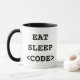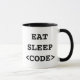 Coma a caneca de café do código do sono para programadores. Ideia bonito do presente para colaboradores e geeks nerdy do Internet. Design de texto Geeky do humor. Faça sua própria paródia engraçada.
