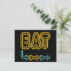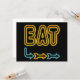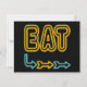 A arte retrô do EAT baseada num cartaz de restaurante neon vintage. As letras são amarelas e vermelhas, as setas são azuis, vermelhas e amarelas. Arte de publicidade divertida para pessoas que cozinham ou comem.