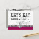 COLOR PALETTE: Fig, framboesa, cinza, preto e branco. DESIGN COLLECTION: Fontes elegantes e divertidas anunciam a mensagem, "Vamos come, bebe e se casa!" em um maravilhoso cartão postal de convite da Bridesmaid. Em uma paleta de cores clara, nítida, nítida, cinza, preta e branca, é a melhor da safra com uma torção moderna. Adicione a sua mensagem pessoal no verso. Feita com uma variedade de fontes, incluindo uma fonte em estilo poster de circo, fonte de caligrafia manual, espirais e ornamentos decorativos de impressoras gravadas vintage para um estilo de vintage moderno.