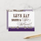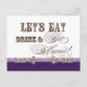 Fontes elegantes e divertidas anunciam a mensagem, "Vamos coma, beba e se case!" em um maravilhoso cartão postal de aviso de data. Em uma paleta de cores clara, nítida, lavanda, púrpura de ameixa, castanha de chocolate e branca, é o melhor da safra com uma torção moderna.