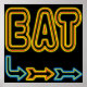A arte retrô do EAT baseada num cartaz de restaurante neon vintage. As letras são amarelas e vermelhas, as setas são azuis, vermelhas e amarelas. Arte de publicidade divertida para pessoas que cozinham ou comem.