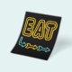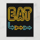 Um modelo de panfleto com a palavra arte retrô EAT baseada num cartaz de restaurante neon vintage. As letras são amarelas e vermelhas, as setas são azuis, vermelhas e amarelas. Arte de publicidade divertida para pessoas que cozinham ou comem.