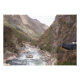 Foto impressão do trem azul do Caminho Inca, que vai de Cusco a Machu Picchu através do Vale do Sacro ou Vale do Urubamba, com grandes montanhas e Rio Urubamba, no Peru.