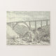 Este quebra-cabeça de aparência vintage apresenta uma representação de um trem que atravessa uma ponte que atravessa um vale.