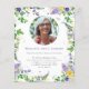 Este é um cartão de convite memorial brilhante e moderno para celebrar a vida do seu amado. Este é um convite favorável ao orçamento impresso em papel. A design apresenta uma fonte de caligrafia com belas mariquinhas botânicas e verde-férn, bem como flores, incluindo picos roxos e hiacintos, além de narcisos amarelos. Este convite pode ser facilmente personalizado com sua própria foto e texto para criar um tributo especial para o funeral, memorial ou celebração da vida de seu ente querido usando o modelo fornecido. Entre em contato com o designer para obter informações sobre este design ou sobre produtos correspondentes.