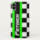 A ajuda protege seu iphone das batidas e dos acidentes pequenos, com estas capas de iphone. Auto capas de iphone gráficas originais do esporte para grande e rapazes pequenos. Aperfeiçoe brotando as auto fãs do motorsport e cabeças da gasolina. Isto projetou excepcionalmente a bandeira chequered gráfico das características do caso e listras verde-clara. Personalize com seu nome. O exemplo lê Patrick. Projetado exclusivamente por Sarah Trett para www.mylittleeden.com