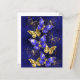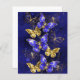 Composição de borboletas luxuosas de safira e joias de ouro em fundo azul texturizado.