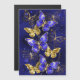 Composição de borboletas luxuosas de safira e joias de ouro em fundo azul texturizado.