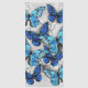 Composição vertical de borboletas de morfo realistas, azuis e brancas sobre fundo texturizado de cinzas. Borboleta azul Morpho.