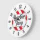 Um relógio de parede único lendo Barber Compra em letras retro em um fundo listrado vermelho e branco cercado por números pretos em um fundo branco. Clique em Personalizar para alterar as cores de fundo e muito mais.