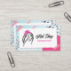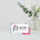 Uma design de cartão de visita eclética que tem uma mulher de cabelo comprido, vestindo um chapéu. Um design de excelente para pessoas que vendem chapéus feitos à mão, feijões, toques e acessórios para cabelos e até seria um bom ajustado para produtos capilares e extensões de cabelo.
