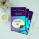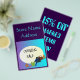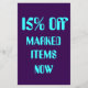 Um panfleto muito colorido anunciando uma venda de abertura para uma mulher compre, cor de fundo do chá. O início de sessão tem um fundo aqua mauve. O texto preto fica em Branco> lê" Abertura da venda " Em Trás> 15% dos itens, espaço para o nome do Compro e do Times. Fotos de bolsas e calçados de vestuário.