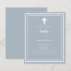 Fundo azul empoeirado, decorado com um quadro branco, e uma cruz branca Personalize e adicione o nome e os detalhes. Texto branco.