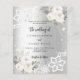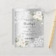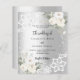 Para um casamento elegante e romântico. Um fundo de aparência pura prateada decorado com florais brancos, rosas, rendas brancas e diamantes falsos. Personalize e adicione seus nomes e detalhes. 1 folha = 1 convite impresso de borda a borda.