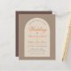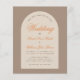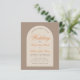 Um convite para casamento moderno com tons de terra neutros. Tem um arco com texto. A palavra Casamento e os nomes são escritos em um roteiro caligráfico laranja elegante. O resto do texto é marrom, a primeira linha é texto arquivado.