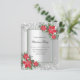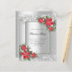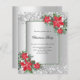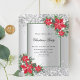 Um fundo com aspecto fino de prata decorado com poinsetos vermelhos, folhas verdes, confetti. Personalize e adicione os detalhes da sua festa. Letras negras. 1 folha = 1 convite impresso de borda a borda.