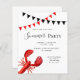 Um convite elegante para uma costa náutica pela festa de verão do mar, festa de praia ou mariscos. Um fundo branco e uma grande lagosta vermelha e bandeiras pretas e vermelhas como decoração. Modelos para detalhes de sua parte, informações. Fundo branco. 1 folha = 1 convite impresso de borda a borda.