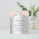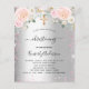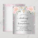 Um convite moderno, na moda e glamouroso para um batizante, batismo celebrando uma menina. Um fundo metálico prateado falsa com brilho falso rosa, faíscas e florais cor-de-rosa. O nome é escrito com um moderno estilo escrito à mão. Personalize e adicione seus detalhes.