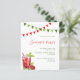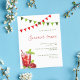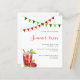 Um fundo branco, uma bebida vermelha e bandeiras vermelhas e verdes como decoração. Modelos para detalhes de sua parte, informações. Fundo branco. 1 folha = 1 convite impresso de borda a borda.