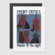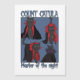 Gatos pretos com capas carmesim e amuletos dourados em um fundo azul; um tema de vampiro divertido, contornos ousados; fantasia gótica encontra charme noturno para criar looks de Halloween assustadores e divertidos.