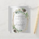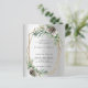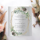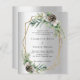 Para um casamento no inverno. Um fundo com aspecto fino de prata decorado com cones, bagas brancas e verde. Um quadro geométrico dourado. Personalize e adicione seus nomes e detalhes. 1 folha = 1 convite impresso de borda a borda.