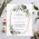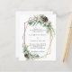 Para um casamento no inverno. Um fundo branco decorado com cones, bagas brancas e verde. Um quadro geométrico dourado. Personalize e adicione seus nomes e detalhes. 1 folha = 1 convite impresso de borda a borda.