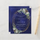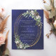 Para um casamento no inverno. Um fundo azul marinho, incolor, decorado com cones, bagas brancas e verde. Uma falsa estrutura oval dourada. Personalize e adicione seus nomes e detalhes. 1 folha = 1 convite impresso de borda a borda.