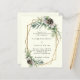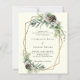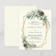 Para um casamento no inverno. Um fundo de cor marfim decorado com cones, bagas brancas e verde. Um quadro geométrico dourado. Personalize e adicione seus nomes e detalhes. 1 folha = 1 convite impresso de borda a borda.