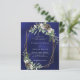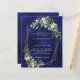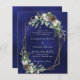 Para um casamento no inverno. Um fundo azul marinho, incolor, decorado com cones, bagas brancas e verde. Um quadro geométrico dourado. Personalize e adicione seus nomes e detalhes. 1 folha = 1 convite impresso de borda a borda.